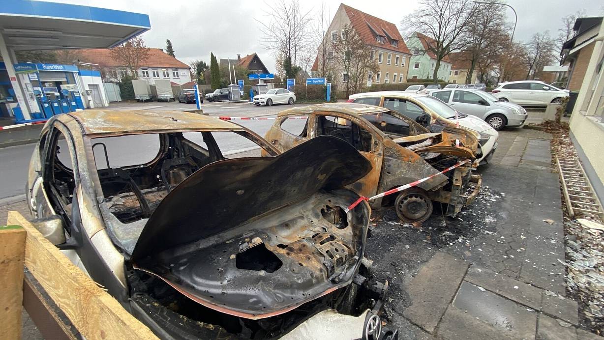 Die abgebrannten Autos stehen auch nach knapp drei Wochen immer noch auf dem Parkplatz. Erst wenn die Versicherung agiert, können die Aufräumarbeiten starten.