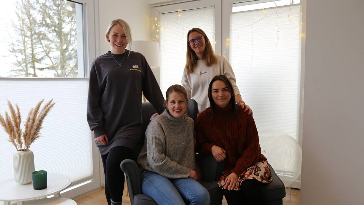 Die vier Hebammen in ihrem Geburtsraum (hinten, von links): Kira Kehlbeck, Tanja Möller sowie (vorne) Maren Scarabis und Sabrina Fransen. | © Lena Kley
