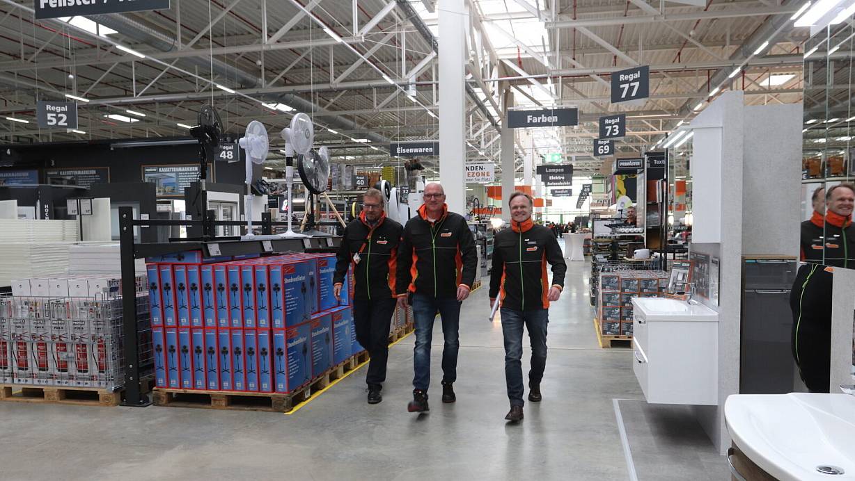 Volker Schneider (Vertriebsleiter Region Nord), Alexander Ulbrich (Marktleiter in Löhne) und Gerald Neumayr (Geschäftsführer Vertrieb) gehen gemeinsam den breiten Mittelgang entlang. | © Judith Gladow