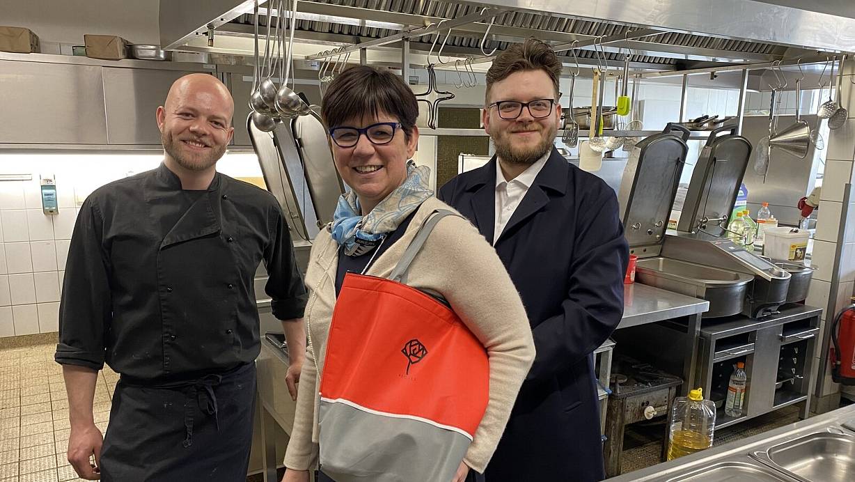 Wie die neue Kochbox, die Claudia Sturm umgehängt hat, ankommt, darauf sind der Koch und Jan-Niclas Sturm (r.) gespannt. | © Dirk Windmöller