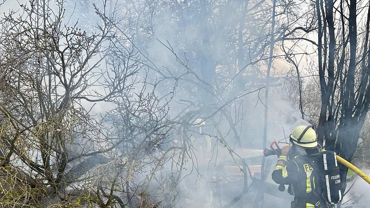 Ein Schuppen in einem Garten gerät in Brand. Die Feuerwehr hat die Flammen unter Kontrolle. Später entwickelt sich jedoch noch einmal Rauch.