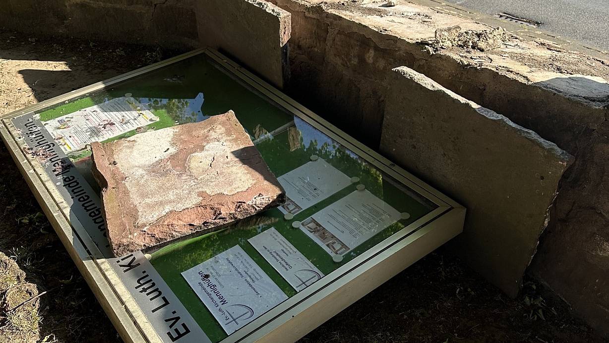 Der zerstörte Schaukasten liegt hinter der Kirchmauer. | © Kirchengemeinde Mennighüffen