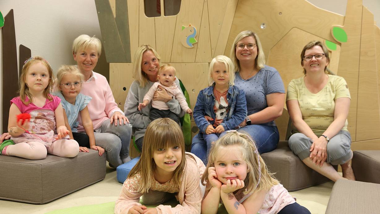 Emily (5, v. l.), Aurelia (4), Claudia Favier, Annelie Albert mit Luise, Alina (5), Frida (5), Elli (5), Jennifer Zöhner und Silke Holdgrewe freuen sich über das Jubiläum des Kindergartens. | © Anthea Moschner
