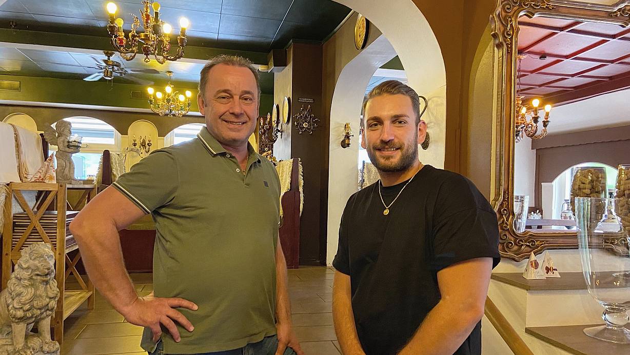 Zwei Generationen Karachatzis kümmern sich um das wohl der Gäste im Restaurant Irodion. Von links: Inhaber und Küchenchef Symeon Karachatzis neben seinem Sohn Stavros. | © Copyright 2023 Wencke Meckenstock . All rights reserved.