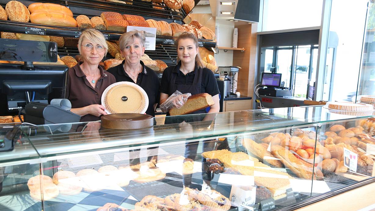 Helene Paul (v. l.), Anke Bruns und Jasmina Havic hinter dem Verkufstresen im Brot- und Kaffeehaus der Bäckerei Schmidt. | © Anthea Moschner
