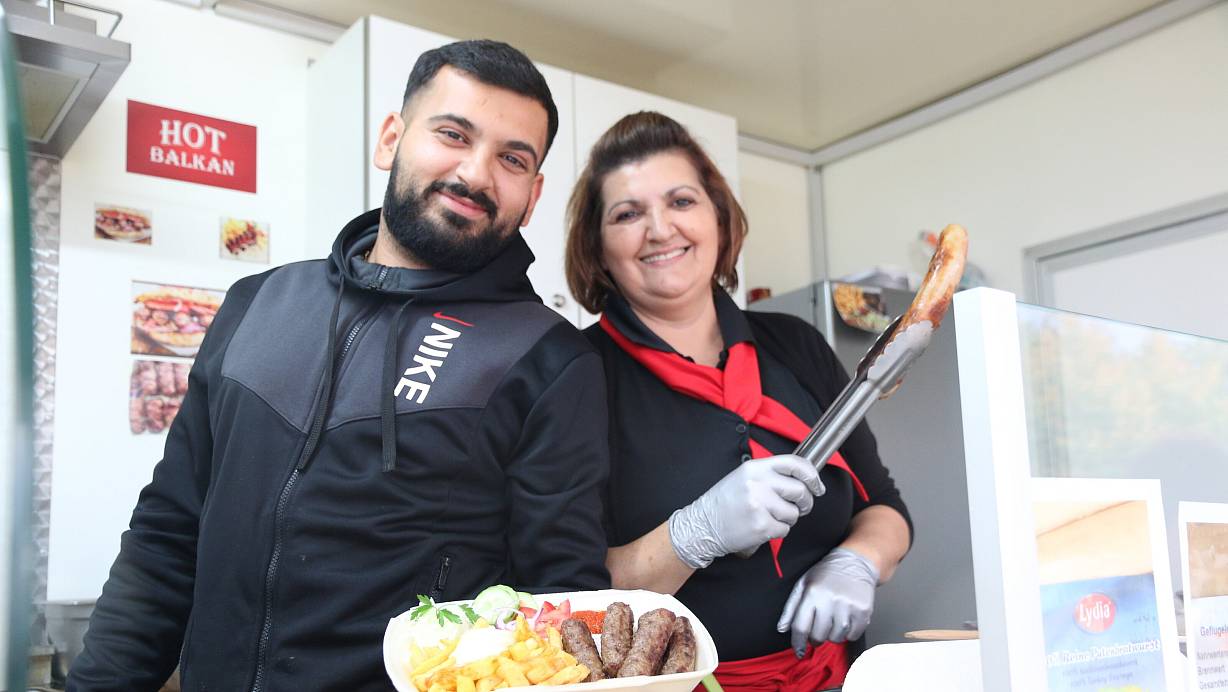 Aleks und Vera vom "Hot Balkan Team" bieten Balkan-Spezialitäten auf dem Findeisenplatz an. | © Anthea Moschner