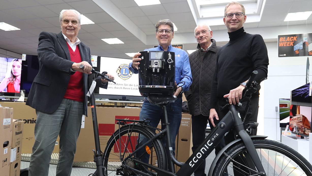 Dietrich Goldstein, Rainer Döring, Eckhard Augustin und TIm Schütte von den Löhner Lions zeigen einige der Gewinne. Dazu gehören E-Bike und E-Scooter genauso wie ein Kaffeevollautomat. | © Judith Gladow