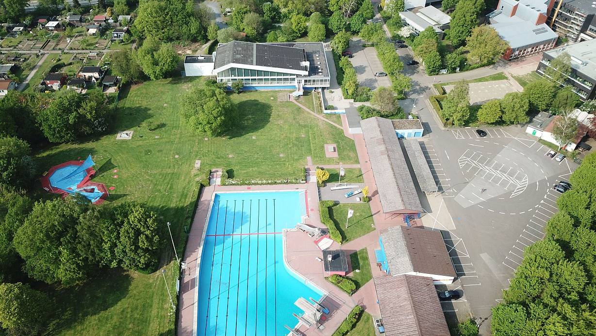 Die Löhner Bäder könnten in Zukunft neu gebaut werden. Während das Freibad in etwa am jetzigen Standort platziert wäre, könnte das Hallenbad (hier am oberen Bildrand) umziehen. Eine Studie schlägt vor, es an der Stelle der Freibadumkleiden (rechts) zu platzieren. Alternativ müssten die Einrichtungen über kurz oder lang geschlossen werden. | © Wolfhard Jording