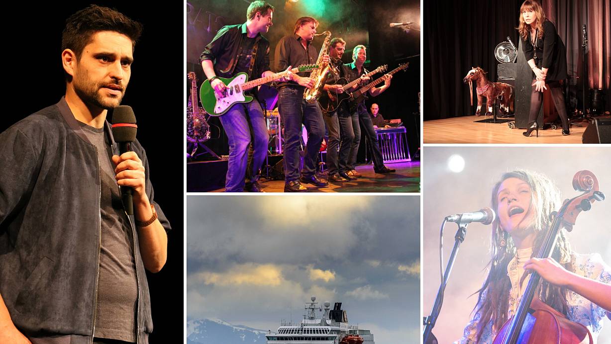 Nektarios Vlachopoulos, Dire Strats, Katie Freudenschuss, Ronja Maltzahn, Multivisionsshow "Norwegen mit dem Postschiff" | © Collage: Felix Eisele