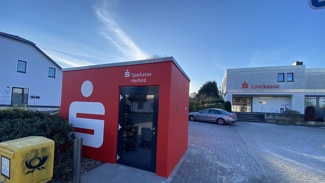 Noch ist der rote Würfel nicht in Betrieb. Den SB-Standort im Gebäude an der Bahnhofstraße will die Sparkasse schließen. | © Dirk Windmöller