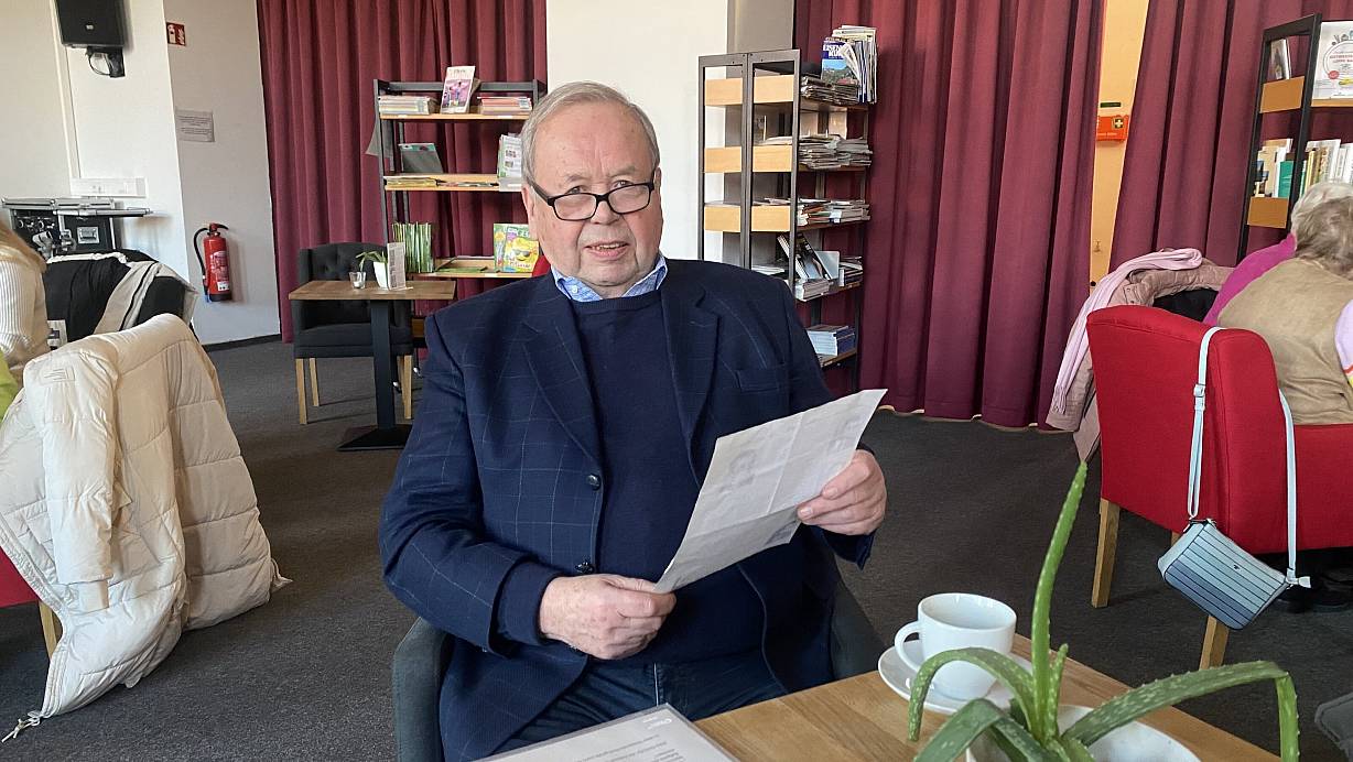 Günter Willig sitzt an einem Tisch im Alten Wartesaal. In der Hand hält er einen Flyer, der für die SPD im Kommunalwahlkampf 1975 wirbt. | © Dirk Windmöller