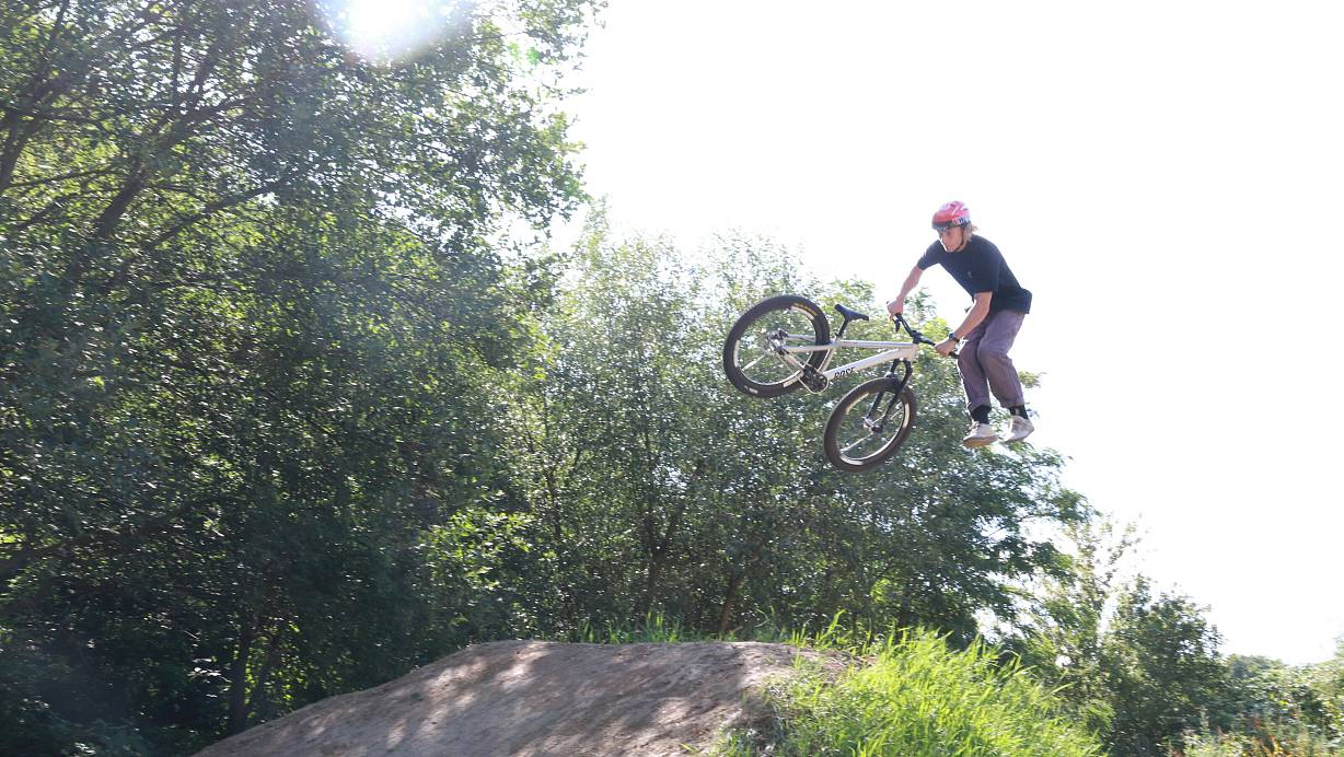 Tobey Miley in seinem Element. Hier macht er einen Tailwhip, also dreht sein Rad unter sich. | © Anthea Moschner
