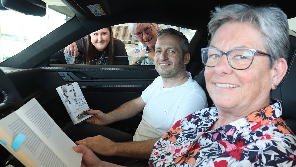Brigitte Förster (vorne) liest normalerweise natürlich nicht am Steuer, demnächst aber im Autohaus Mahnerfeld. Inhaber Temel Bulut freut's. Anastasia Vollmer vom Autohaus (l.) und Regina Blomenkamp von "Löhne liest" auch. | © Judith Gladow