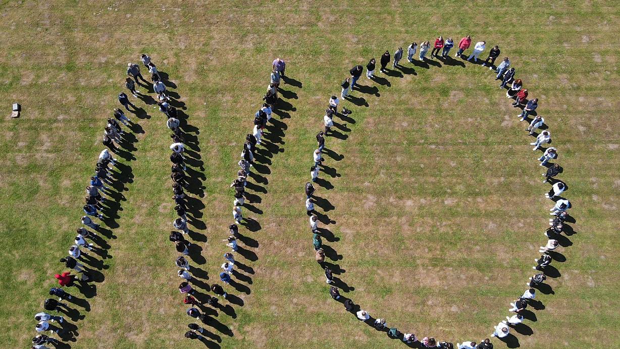 Rund 200 Schüllerinnen und Schüler bilden das "No", das von einer Drohne fotografiert wurde. | © BBG