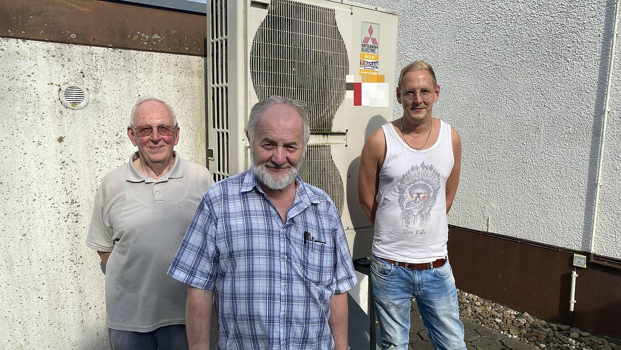 Karl-Heinz Isemann (v. l.), Detlef Reuter und Dominik Isemann vor der Wärmepumpe.Sie hat hohe Stromkosten verursacht. | © Dirk Windmöller