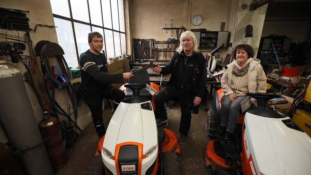 Schlüsselübergabe der besonderen Art: Christina und Andreas Thätmeyer (v.r.) übergeben Werkstatt und Geschäft an Sascha Markovic - zünftig symbolisiert durch einen kräftigen Schraubenschlüssel. | © Jörg Stuke