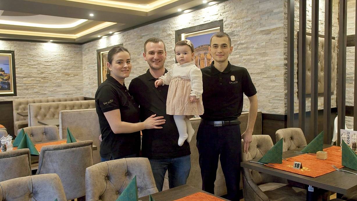 Familie Hajdaraj freut sich auf ihre Gäste (von links): Rebeka, Erjus mit Eloise und Uenti Hajadaraj im Restaurant Korfu. | © Wencke Meckenstock