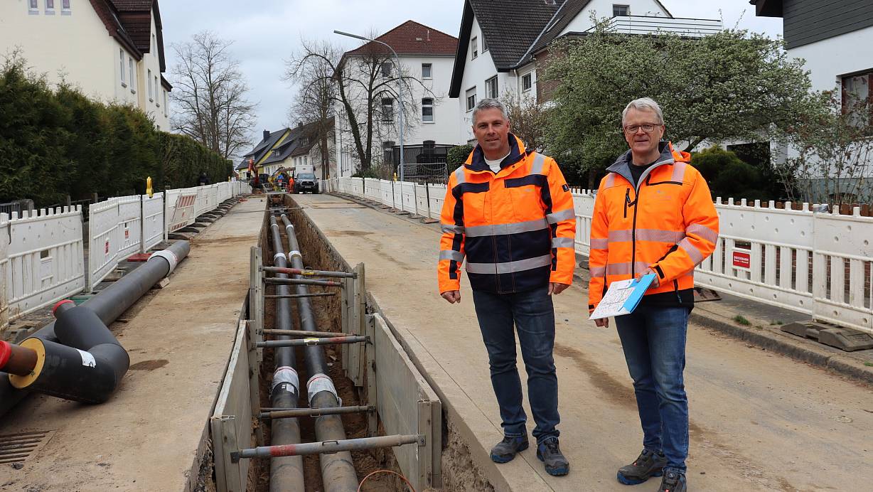 Thomas Liebig (l.) und Fred Wokittel auf der Nahwärme-Baustelle. Links daneben sind die beiden dicken Rohre zu sehen. | © Judith Gladow