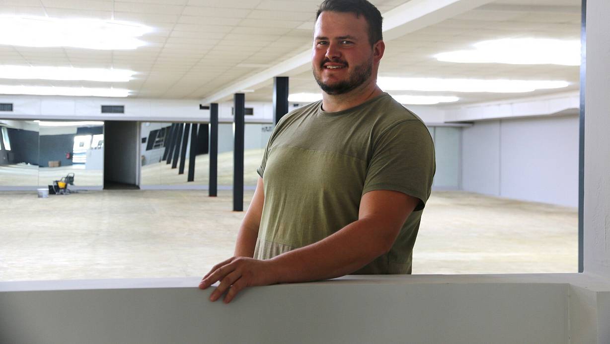 Sven Bestvator mit der zukünftigen Trainingsfläche im Hintergrund. Wenn die Geräte stehen, soll hier losgeschwitzt werden können. | © Anthea Moschner