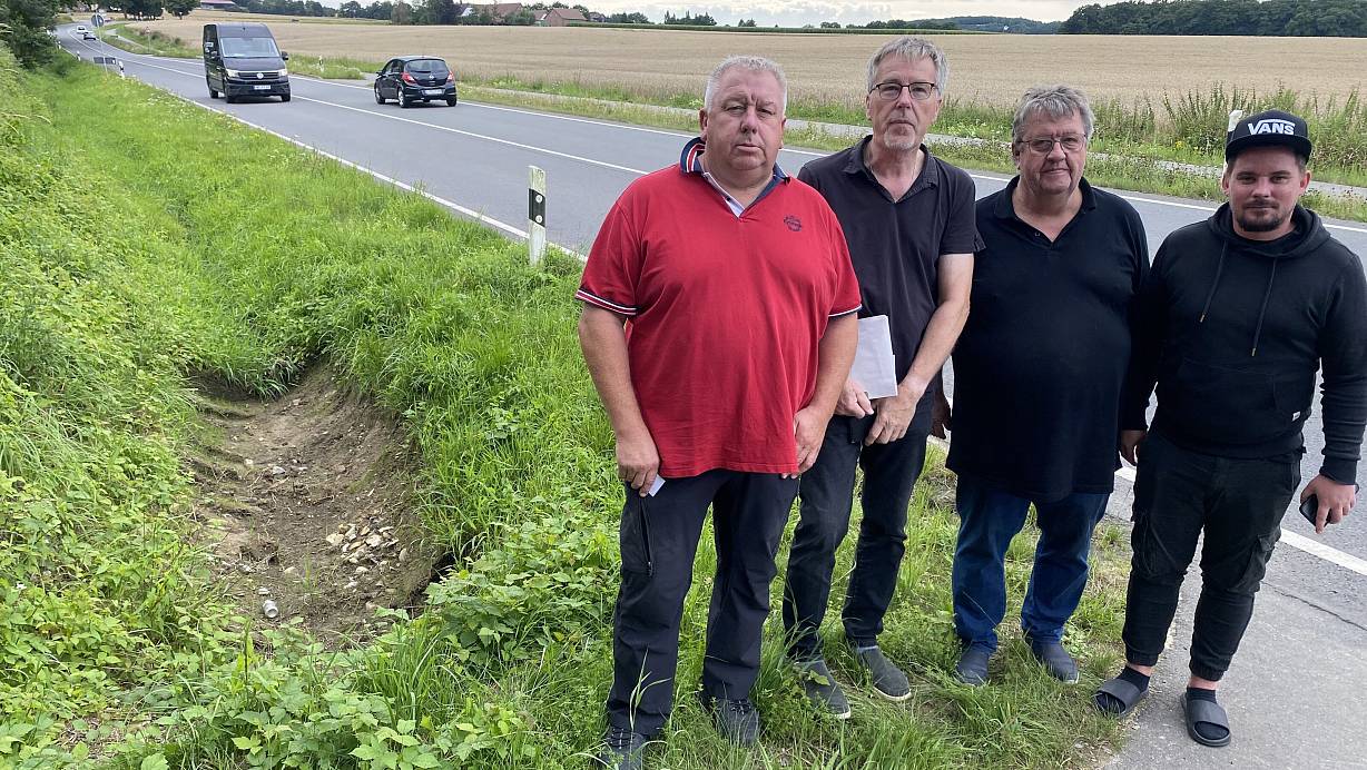 Volkhard Möller (v. l.), Jürgen Meyer, Georg Kuhlmann und Patrick Rotzoll am Rand der Koblenzer Straße. Links hinter ihnen ist der Graben zu sehen, von dem nur ein kleines Stück ausgekoffert wurde. | © Dirk Windmöller