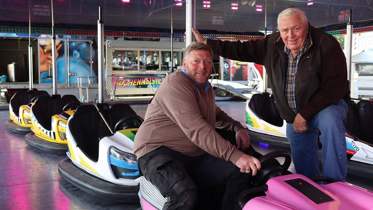 Alfred (85) und Dirk (56) Küchenmeister zusammen am Autoscooter. Das Fahrgeschäft ist der ganze Stolz der Schaustellerfamilie. | © Veronika Kinsfator