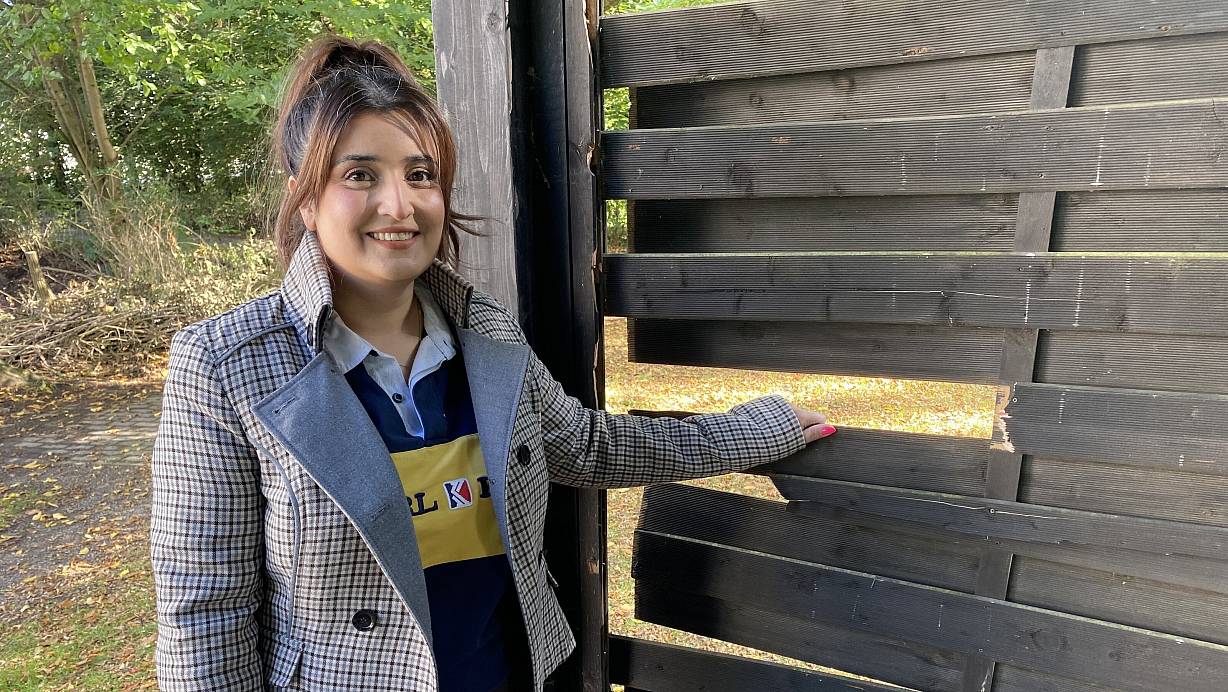 Ayfer Özdogan steht an der Holzwand, an der die Bretter herausgeschlagen oder -getreten wurden. | © Dirk Windmöller