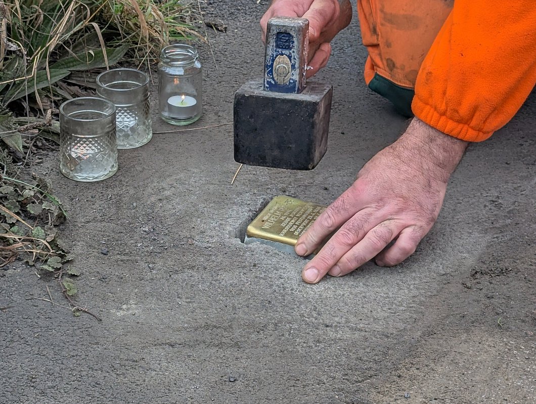 Knapp ein Jahr später wird der Stein an der Hausnummer 12 der Straße „In den Ellern“ wieder eingesetzt. Arbeiter der Stadtwerke Löhne schlagen ein passendes Loch in den Straßenrand. Immerhin befindet sich die Messingplatte auf einem Betonquader, der nicht groß herausragen sollte. Neben den Arbeitern beobachten auch Nolte, Mitglieder des Löhner Bündnis für Vielfalt sowie der Baukoordinator für die Glasfaserarbeiten in Obernbeck und Löhne-Ort die Neuverlegung.