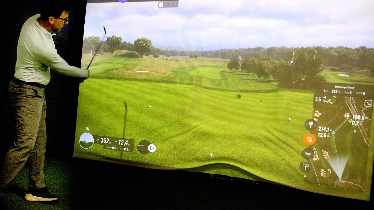 Indoor-Golf: PGA-Golfprofessional Jörn Neumann (besitzt seit 2001 eine Golfschule im GCW, ist Golf-Trainer seit 1994) hat abgeschlagen in der Aurivolt Indoor Golf Lounge. Hier auf der Leinwand ist digital dargestellt ein Platz auf einer Anlage in New York, wo im September der 45. Ryder Cup zwischen USA und Europa ausgespielt wurde. | © Egon Bieber