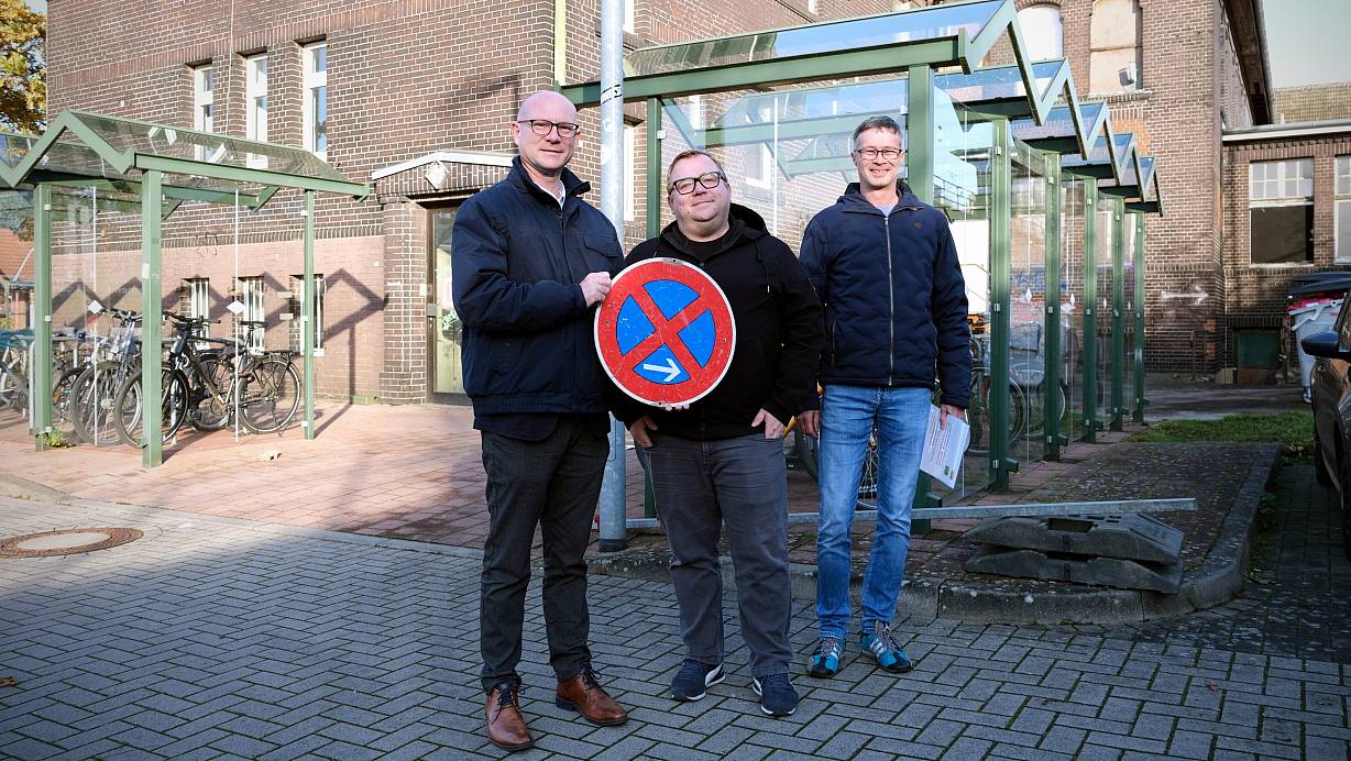 Das Parkverbotsschild haben Christian Antl (v. l.), Alexander Jost und Marc Recksiek schon parat. Die Stellflächen und Fahrradständer im Hintergrund fallen dann weg. | © Felix Eisele