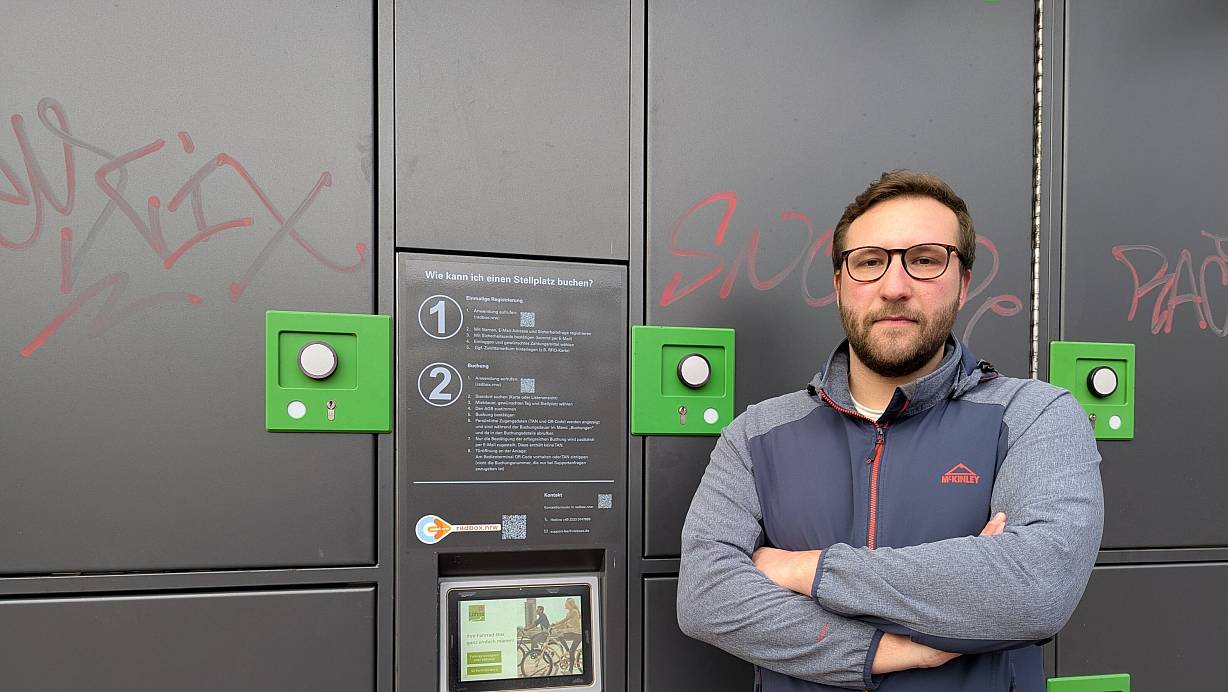 Klimaschutzmanager Philipp Hottenrott vor den Fahrradboxen, die 2021 gegenüber vom Löhner Bahnhof aufgestellt wurden. | © Alex Wall