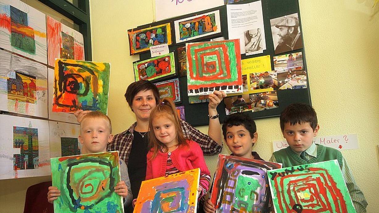 Die Fünf- und Sechsjährigen haben mit ihrer Erzieherin Inga Hattwig mit Filzstift, Buntstiften und Abtönfarben gemalt. Die bunten Gemälde sind ab sofort im Windfang im Eingangsbereich des Kindergartens zu sehen. Außerdem haben die Kinder ein Spielzeughaus aus Pappmaché nach Hundertwasser gestaltet. Die Bilder sind solange im Kindergarten zu sehen, bis sie die Eltern mit nach Hause nehmen.