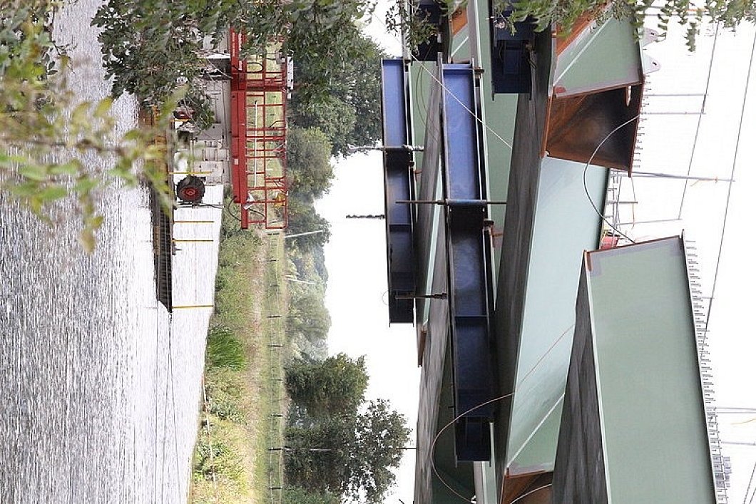 Zwischen den nördlichen und südlichen Trägern fehlt mitten über der Werre nur noch ein Zwischenraum von etwa zwei Metern. Dieser muss noch mit sogenannten "Lückenschluss-Elementen" geschlossen werden. Bei der bestehenden seitlichen Abweichung ist das nun jedoch mit ganz erheblichem Aufwand verbunden. Die Brückenteile müssen mit starken hydraulischen Pressen verschoben werden, bis die Träger wieder exakt aufeinander zu laufen.