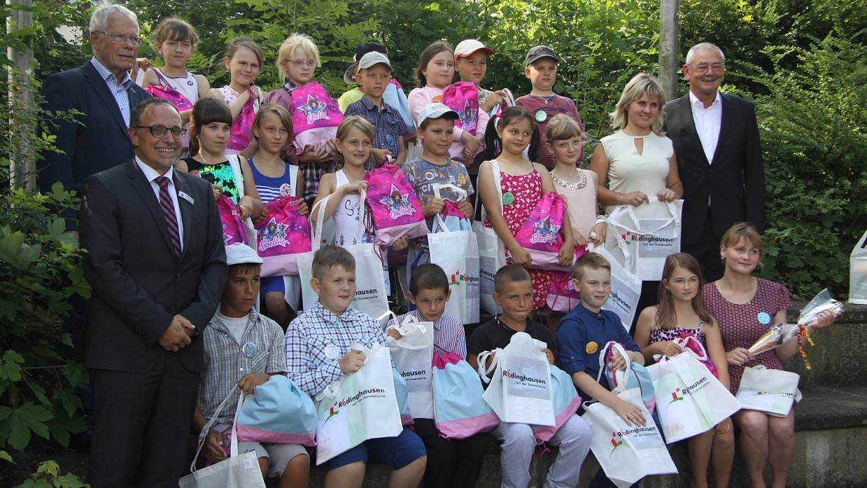 20 Jungen und Mädchen sowie ihre Lehrerinnen Alena Vasiukevich und Alina Khaladtsova aus der Region Tschernobyl besuchen in den Ferien den Kreis Herford. In Empfang genommen wurden sie vom Rödinghausener Bürgermeister Vortmeyer, dem Vorsitzenden des Vereins Kinder aus Tschernobyl in Herford Klaus Wörmann und Siegfried Lux von der Sparkasse Herford. | © Carina Schmihing