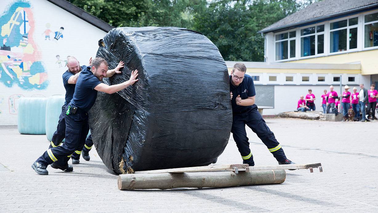 Zum ersten Mal: Die Löschgruppe Rödinghausen der Freiwilligen Feuerwehr richtet ein Strohballen-Wettrollen aus. 13 Mannschaften nehmen teil und überstehen den Parcours