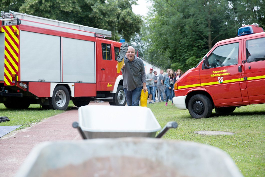 Nach dieser Herausforderung wartet noch der Stiefelwurf in zwei Schubkarren auf die Mannschaften, womit bei erfolgreichen Treffern Zeitgutschriften für die anderen Übungen gesammelt werden können. Einige Kinder feuern von der nebenstehenden Hüpfburg an. Das scheint zu helfen: Am Ende liegen doch so einige Stiefel in den Schubkarren. Die letzte Station beinhaltet Schätzfragen aus verschiedenen Kategorien.
