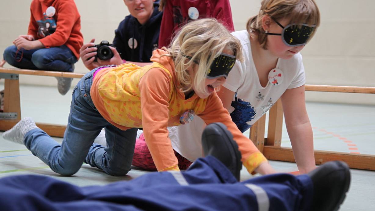 Rödinghausen. Ganz vorsichtig tasten sich Alanna und Mia auf dem Boden voran. Beiden wurde mit einer Augenklappe die Sicht genommen. Ihre Aufgabe: Findet die Puppe und bringt sie in Sicherheit. Immer wieder sprechen sich die beiden Mädchen mit kurzen Aussagen ab. Mit „Wand vorne" oder „rechts frei" beschreiben sie sich gegenseitig ihre Erkundungen. „Hab sie", ruft Mia plötzlich, als sie die zu bergende Puppe ertastet. „Jetzt beginnt der anstrengende Teil", sagt Übungsleiter Peter Mende. Die beiden Kleinen müssen die Puppe nun vorsichtig aus der fiktiven Gefahrenzone herausziehen.