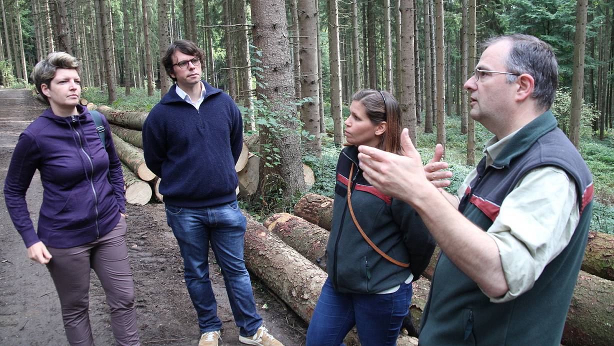 Zwei Landtagsmitglieder von den Grünen machen sich in Rödinghausen ein Bild davon, wie der Klimawandel auch hier dem Wald zusetzt.