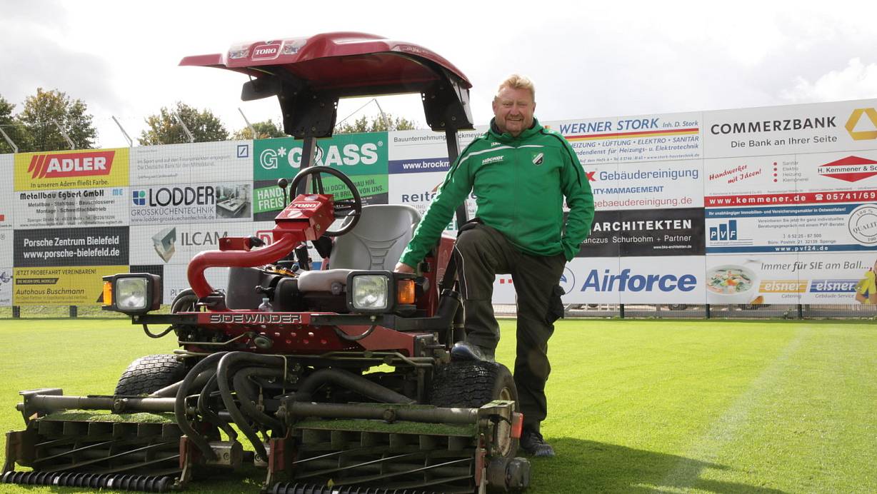 Ralf Menke kümmert sich im Häcker Wiehenstadion um den Rasen. | © Torben Stallmann