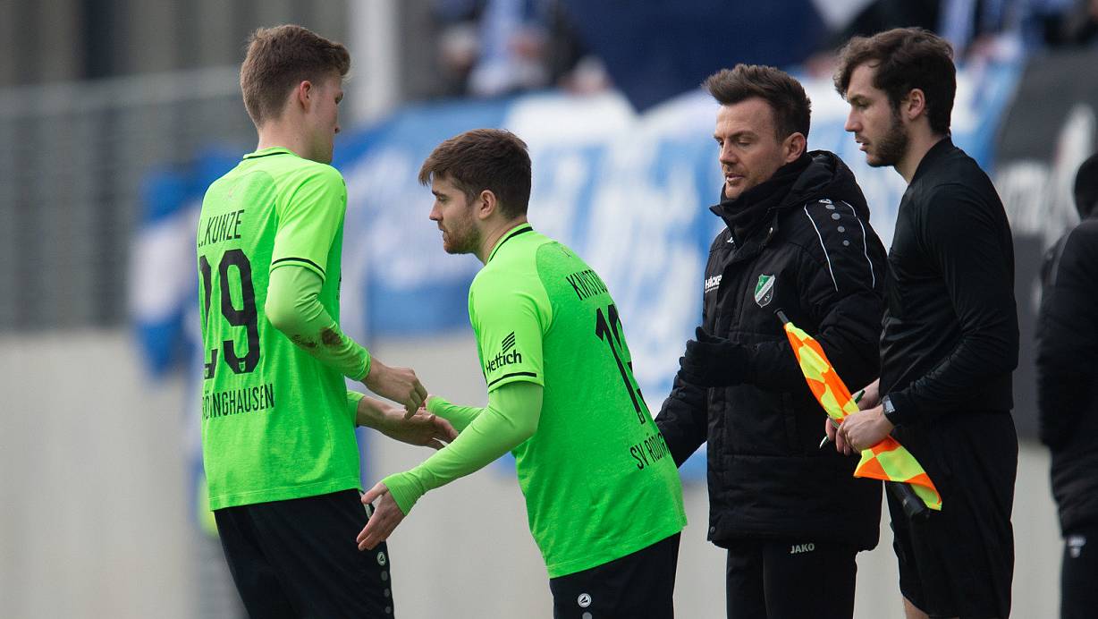 Mehr als nur eine Einwechslung: Auf diesen Moment, in einem Regionalligaspiel des SV Rödinghausen wieder aufs Feld zu dürfen, hat Nico Knystock (2. v. l.) eine fußballerische Ewigkeit warten müssen. | © Noah Wedel