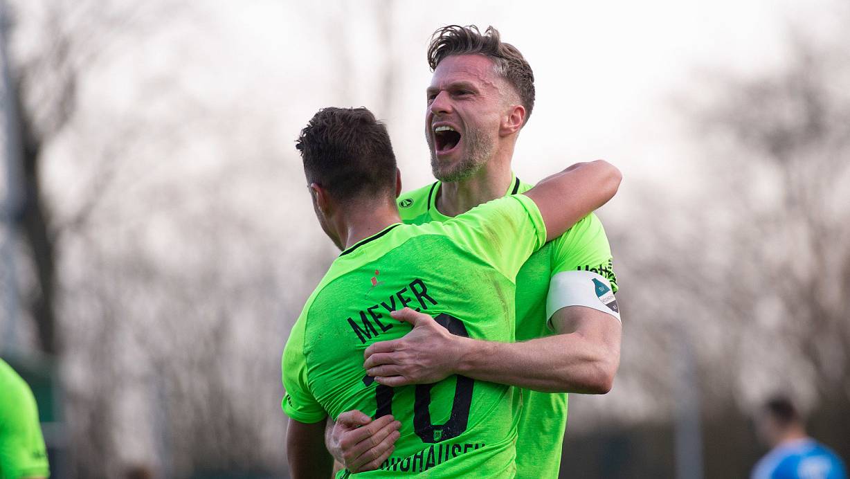 Daniel Flottmann (hier mit Linus Meyer) bleibt dem SV Rödinghausen als  Anführer in der Fußball-Regionalliga über das Saisonende hinaus erhalten. | © Noah Wedel