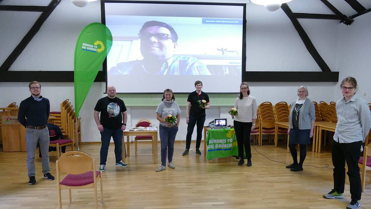 Tim Kownatzki (Grüne Jugend Spenge, v. l.), Maik Babenhauserheide (Beisitzer im Kreisverband Herford), Frank Jarmuschke per Video (Kassierer im Ortsverein), Birgit Westphal (Beisitzerin), Ansgar Lübrecht (Sprecher des Ortsverbands), Andrea Haack (Sprecherin des Ortsvereins), Angelika Fleischer und Beisitzer Malte Schäffer. | © Thorsten Mailänder