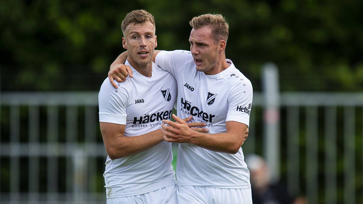 Punkt zum Auftakt: Rick ten Voorde (l.) nach seinem Elfmetertor zum 1:0 mit Tobias Reithmeir. Nach dem 1:1 im Heimspiel gegen Preußen Münster soll nun der erste Dreier her. | © Noah Wedel