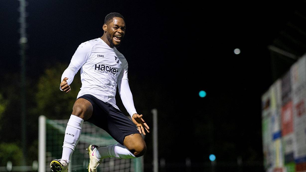 Ich heb’ ab, nichts hält mich am Boden: Rödinghausens Stürmer Ba-Muaka Simakala jubelt nach seinem Treffer zum 1:0. Ein zweiter sollte folgen. | © Noah Wedel