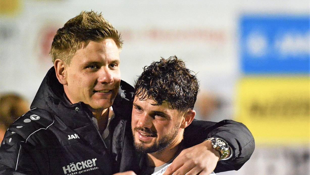 Umarmung für den Siegtorschützen: Rödinghausens Sportchef Alexander Müller herzt Vincent Schaub. | © Joel Beinke