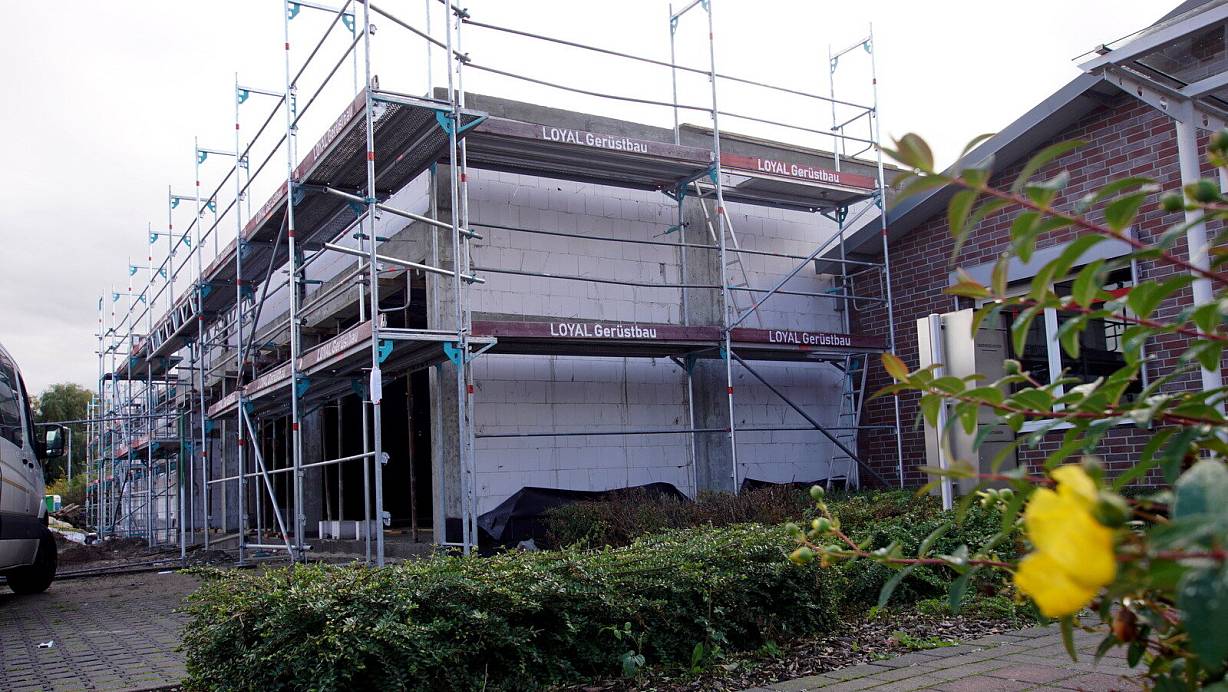 Die Mauern und das Gerüst stehen. Neben der Sparkassen-Filiale entsteht der neue Rossmann-Drogeriemarkt in Bruchmühlen. | © Niklas Krämer