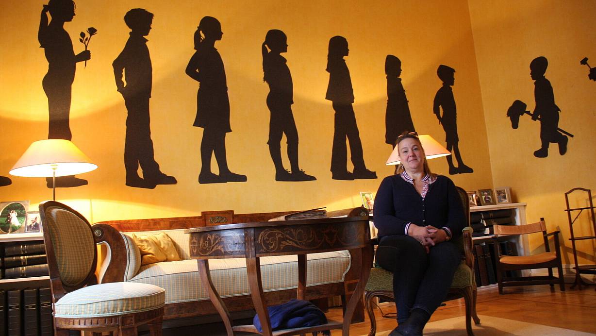 Nadia Lange vor den Scherenschnitten ihrer Nichten und Neffen sowie ihrer eigenen drei Kinder: Larissa (v.l.), Henry, Katinka, Natalia, Lilly, Hannah, Oskar, Gustav und Julius zieren die gelbe Wand des Enkelzimmers auf Gut Böckel. Langes Kinder sind Hannah, Oskar und Gustav. | © Anne Neul