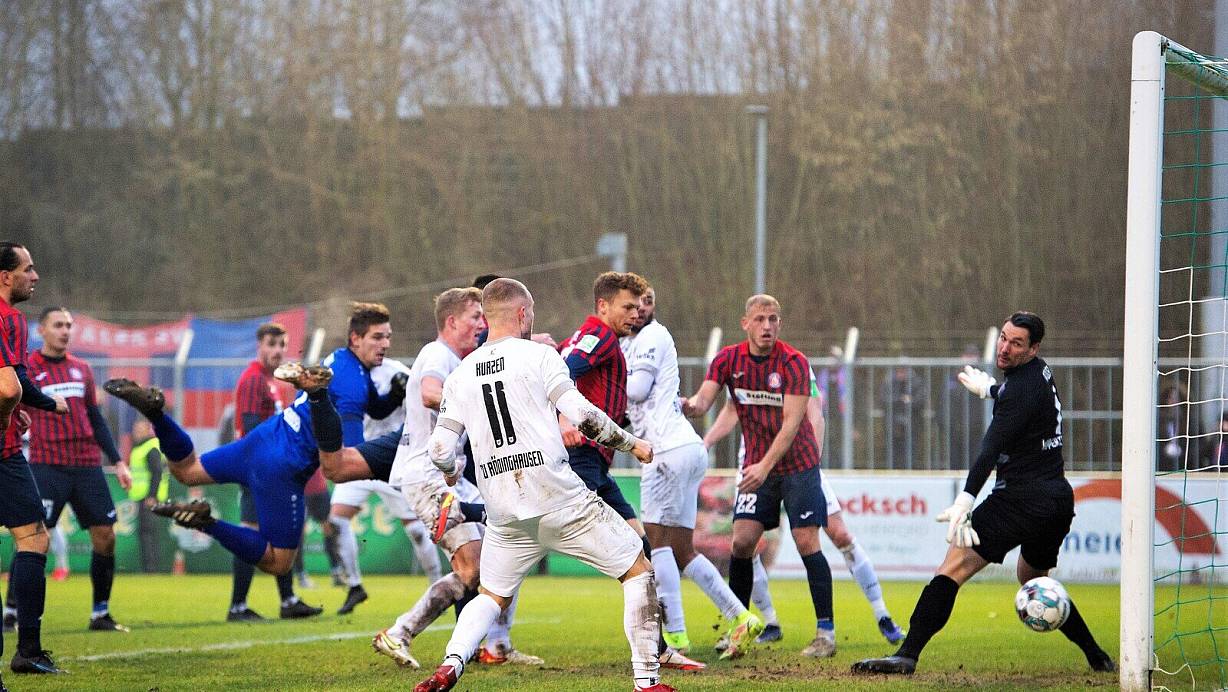 Das Kopfball-Tor von Rödinghauens Torhüter Alexander Sebald im Spiel gegen Wuppertal. | © Joel Beinke