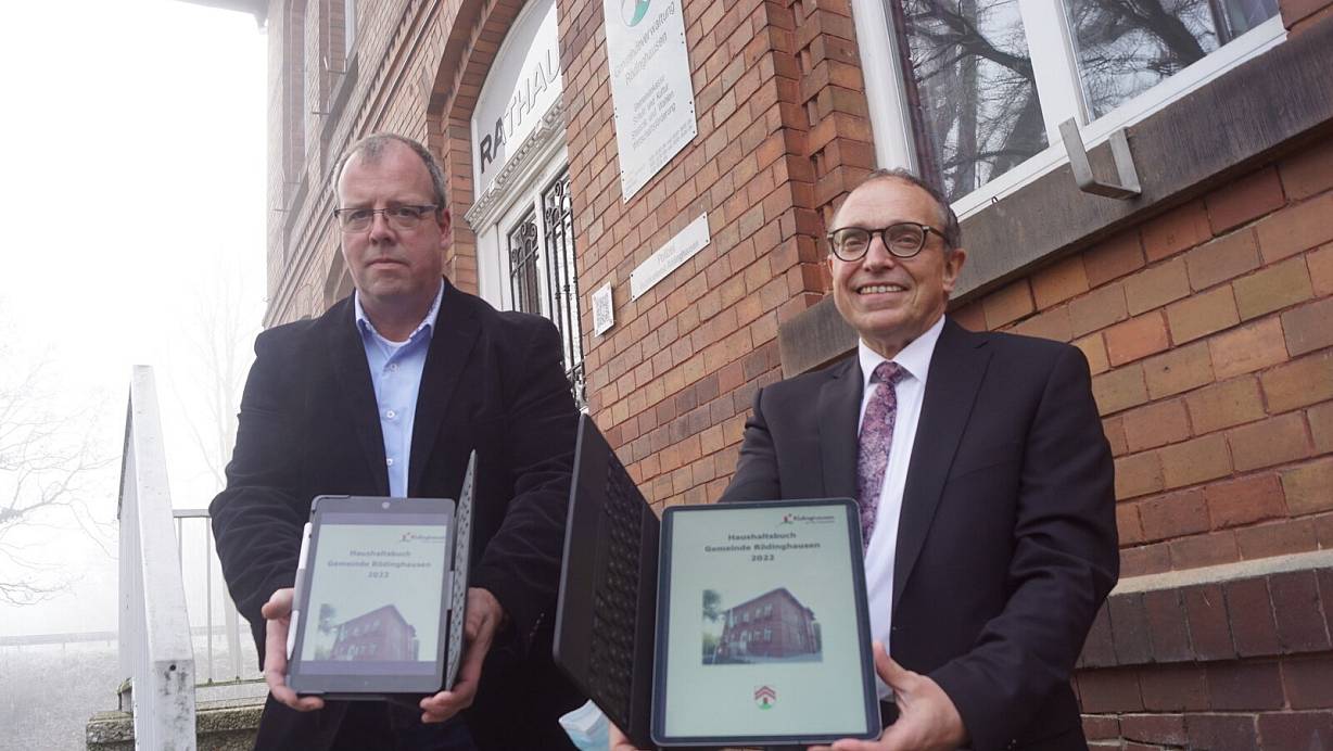 Christian Nollmann (stellvertretender Kämmerer, l.) und Bürgermeister Siegfried Lux stellten im Dezember den Haushaltsplan für 2022 vor. Für diesen haben sich jetzt alle Fraktionen ausgesprochen. Foto: Krämer | © Niklas Krämer