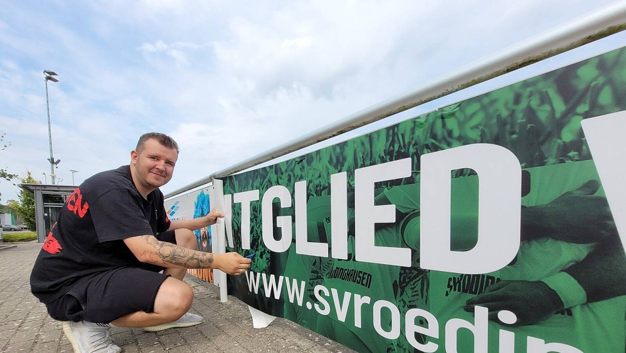 Werbefachmann Florian Hahn bringt die Werbebanden am Stadion in Schuss. | © Florian Weyand