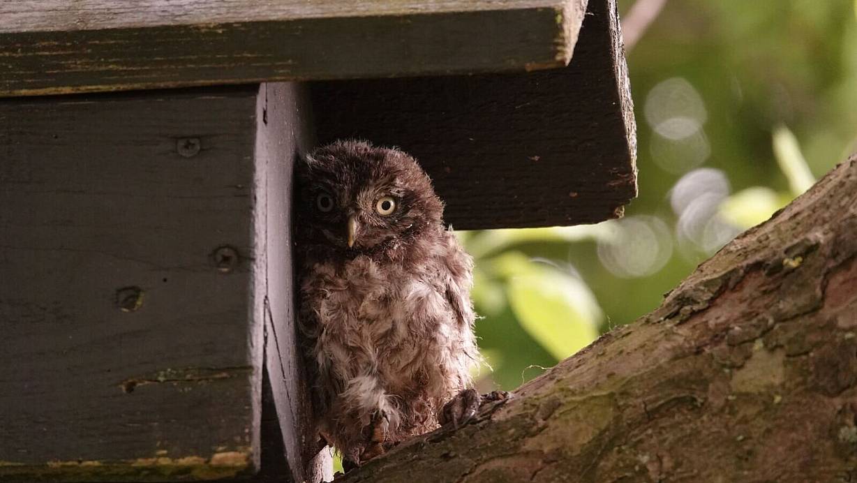Dieser junge Steinkauz-Ästling ist zwar schon recht neugierig, mag sich aber noch nicht so recht von seinem Zuhause entfernen. Der Findling, um den es in der aktuellen Geschichte geht, war schon etwas älter. | © Angelika Meister
